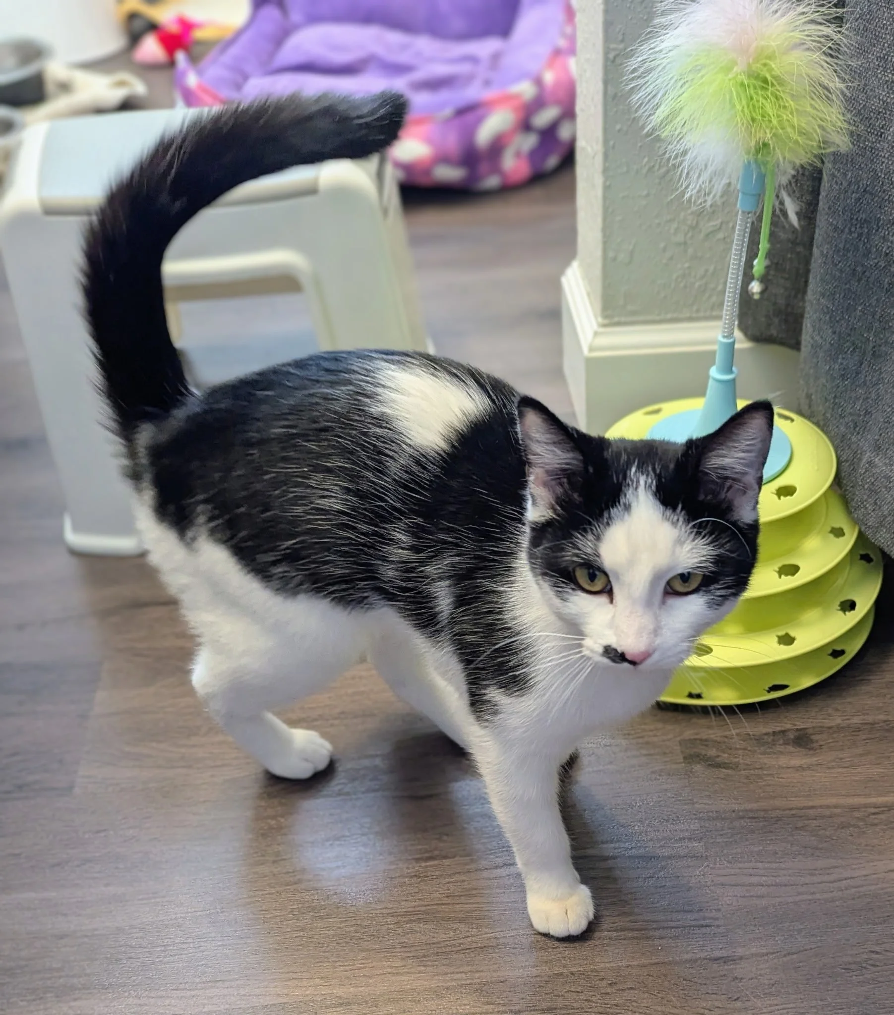 Othello was born with a birth defect called Carpal laxity, where his front legs turn in, his right leg is significantly more turned that the left. He is still a playful, active and extremely affectionate kitten. His Vet said the best thing to do for his condition is to just let it be.