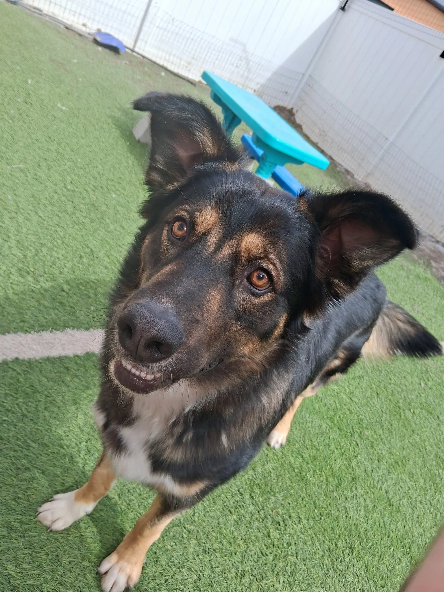 This stunning boy just turned one, he is a German Shepherd mix, neutered, microchippedand vaccinated. Milo would really love an active playmate to spend the day with, he is good with his foster dog friends, was raised with small kids and also cats. He is a very affectionate lap dog!